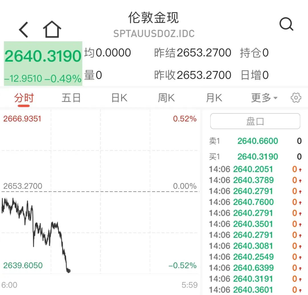 数据显示,截至10月7日14时左右,现货黄金日内跌0.49%,报2640.319美元/盎司,较9月26日的历史高点2685.579美元/盎司小幅回落。