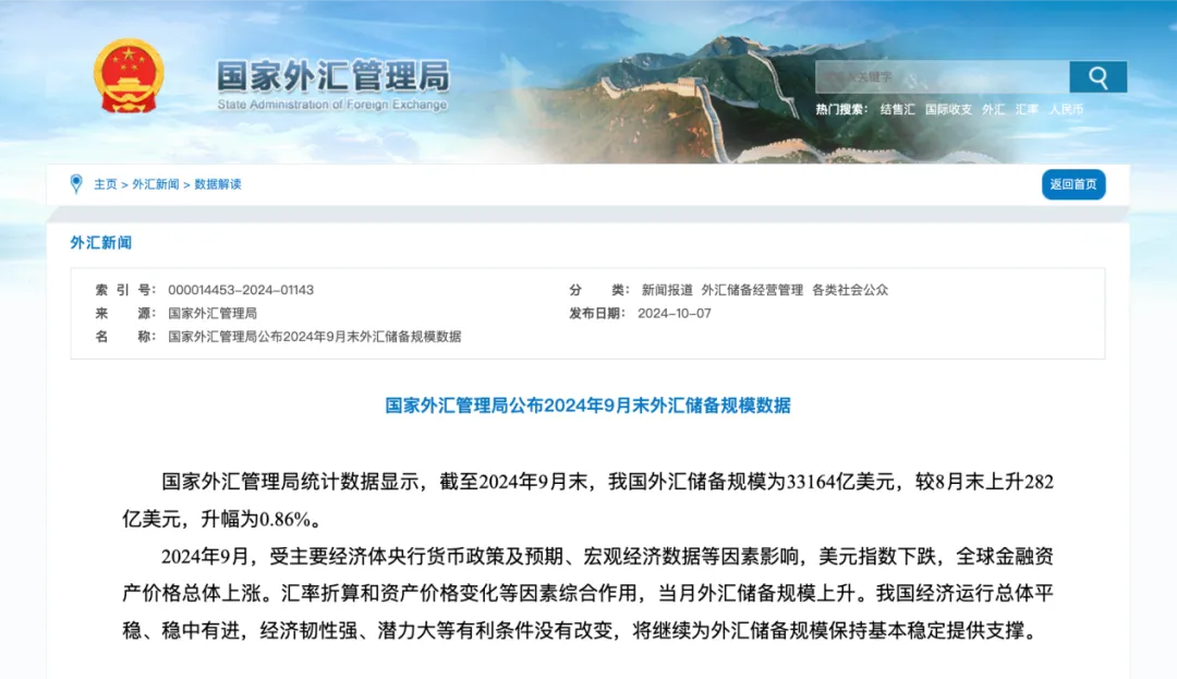 10月7日,国家外汇管理局统计数据显示,截至2024年9月末,我国外汇储备规模为33164亿美元,较8月末上升282亿美元,升幅为0.86%。值得注意的是,这是我国外汇储备连续第三个月环比上升,也是自2015年12月以来首次站上3.3万亿美元大关。