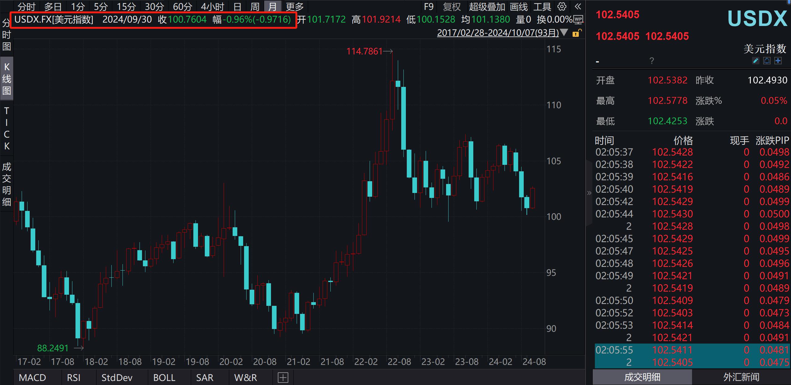 9月份,美元指数收于100.7604,其间跌0.96%。尤为受到关注的是,北京时间9月19日,美联储宣布降息50个基点,这是美联储历经数年加息后首次降息,且幅度较大,随后短时间内美元指数迅速回落。