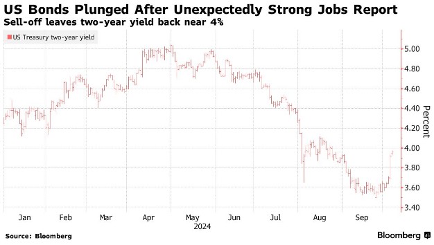 上周,美国9月非农就业数据意外强劲,降低了美联储再次大幅降息的可能。美国国债延续了上周晚些时候的跌势,周一持续下跌,基准美债收益率回到4%,为自8月以来首次,10年期美债收益率上升4个基点至4.01%,两年期美债收益率上升8个基点至4%。