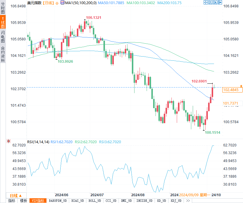 美元指数在本周继续巩固涨势,达到102.60的水平。这一数字接近上周五的七周高点102.69,显示出美元在过去几天内的显著回升。本周迄今,美元指数已上涨超过2%,为两年来的最大周涨幅之一。值得注意的是,美元指数上周初曾略高于100,显现出在100.00水平附近的坚实支撑。