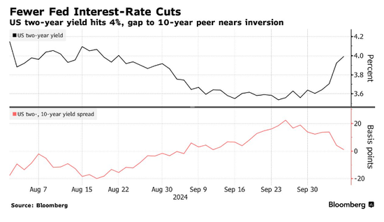 上周五井喷的非农就业报告迫使交易员重新评估美联储的货币政策前景。美国国债周一延续暴跌,10年期国债收益率上涨4个基点至4.01%,而2年期国债收益率上涨8个基点至4%。