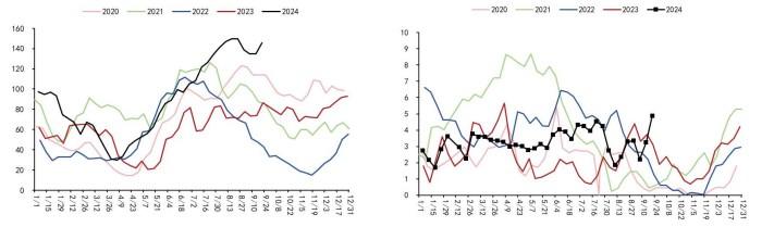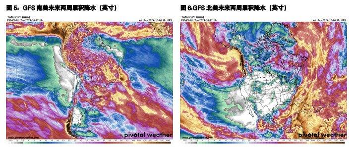 天气方面,预报显示直到未来两周美豆主产区降雨较少。巴西中部降雨预计推迟到10 月10号附近回归,2024092900Z 预报显示累积降雨量环比回升,累积雨量较好,南部南里奥格兰德州、巴拉那州等有较多降雨。阿根廷降雨正常。