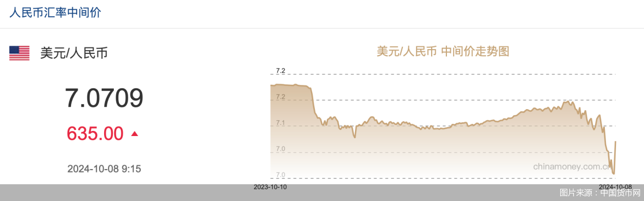 北京商报讯(记者岳品瑜董晗萱)国庆长假结束后,人民币汇率出现较明显波动。10月8日,人民币对美元中间价报7.0709,前一交易日中间价报7.0074。人民币中间价调贬635个基点,创下了2022年5月6日以来的最大贬幅。