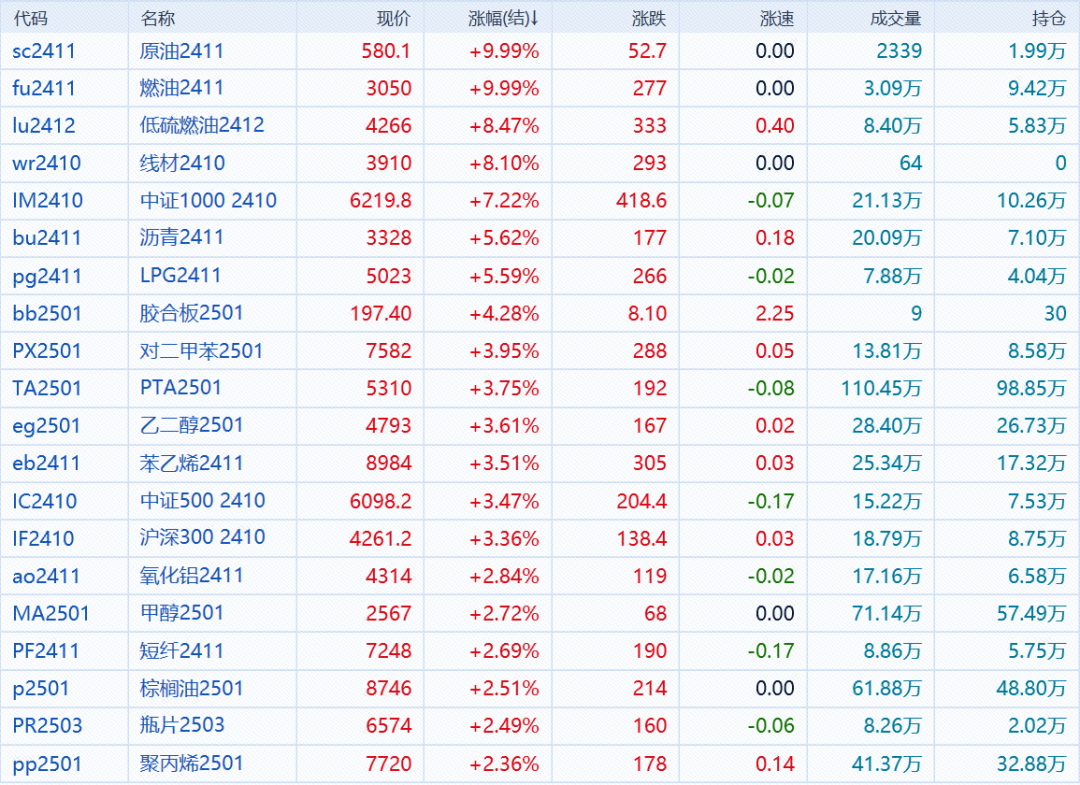 沪深300股指期货(IF)主力合约涨3.36%,上证50股指期货(IH)主力合约涨0.54%,中证500股指期货(IC)主力合约涨3.47%,中证1000股指期货(IM)主力合约涨7.22%。