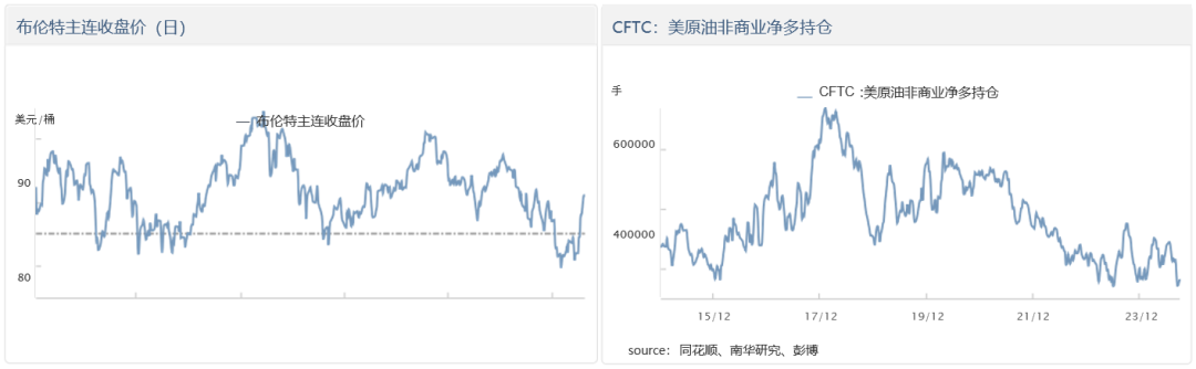在伊朗导弹袭击以色列之前,布伦特原油在整个三季度价格持续偏弱,基本面上看到:OPEC+准备在12 月增产;汽油消费旺季已过,后续成品油需求环比回落;前期美欧经济数据持续不及预期等。CFTC原油投机净多持仓也降至历史 低位。10月1日布伦特原油一度跌至70美元/桶附近。一切似乎都朝着对空头有利的方向进展。