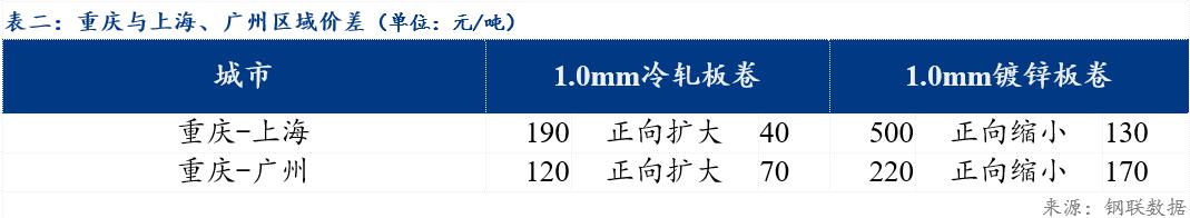 重庆、上海地区冷轧板卷区域价差扩大40元/吨;重庆、广州冷轧板卷区域价差扩大70元/吨。重庆、上海镀锌板卷区域价差缩小130元/吨;重庆、广州镀锌板卷区域价差缩小170元/吨 。镀锌、冷轧品种价差由正转负120元/吨 ;镀锌、热轧品种价差扩大70元/吨 ;冷轧、热轧品种价差扩大190元/吨 。