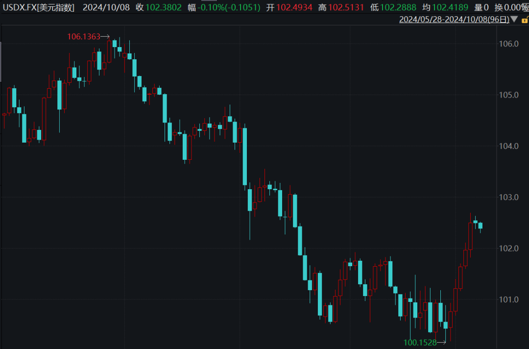 消息面上,10月4日,美国公布的非农就业数据显示,9月非农就业人口增加25.4万人,远超预期的15万人。美国的失业率也低于预期,交易员普遍取消了对美联储11月降息50个基点的押注。受此影响,美元指数走高,突破102大关。