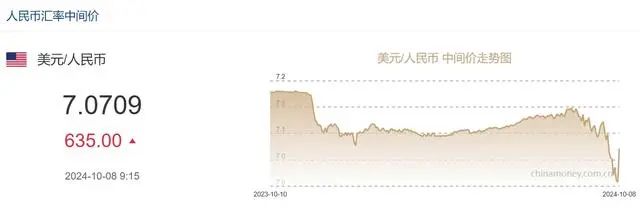 同时,据中国人民银行公告,当日银行间外汇市场人民币汇率中间价为1美元对人民币7.0709元。相较于9月30日央行发布的人民币汇率中间价7.0074元,人民币中间价调贬635个基点,创下了2022年5月6日以来的最大贬幅。