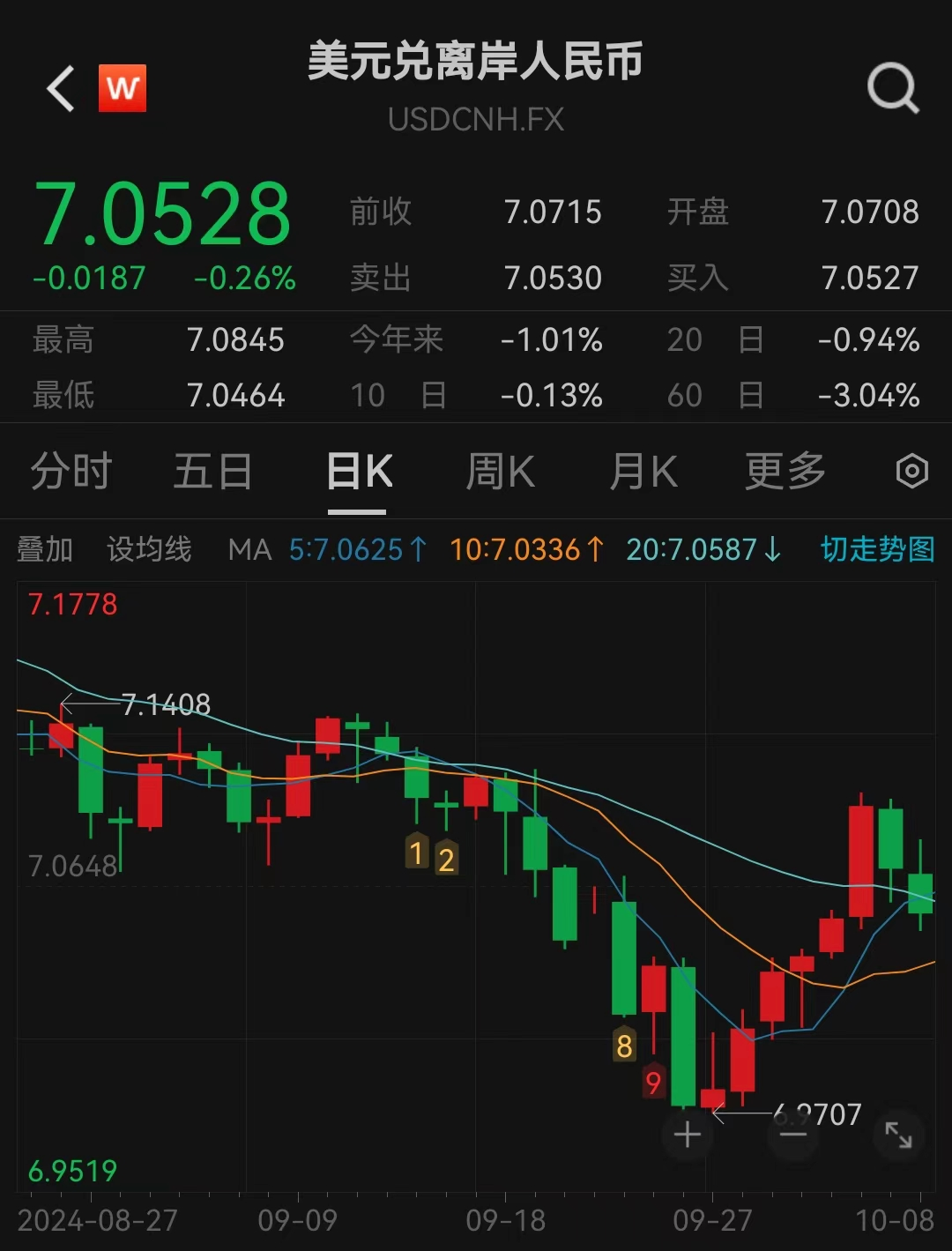 10月8日,在岸人民币兑美元收盘报7.0535,较上一交易日下跌379点。