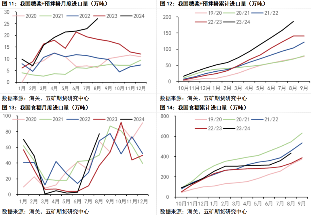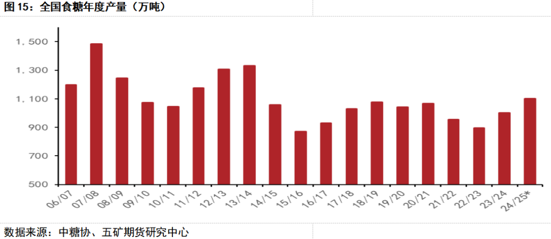 9月广西、广东、海南等甘蔗主产区受台风“摩羯”影响,局地甘蔗倒伏、折断,但总体影响并不大。就目前而言,南宁、崇左地区受台风影响甘蔗单产略微偏低,但也跟去年同期持平。桂北地区如柳州、来宾甘蔗单产水平是高于去年。广西各集团预计甘蔗种植面积增幅都在10-20%,因此广西增产幅度可能会比较大。其余产区方面,2024/25榨季新疆糖产量有望创新高,从56万吨大增至70万吨以上。内蒙古糖产量预计从上榨季的54万吨提高至65-70万吨左右。预计2024/25榨季全国食糖产量将达到1100-1150万吨,同比增加104-154万吨。