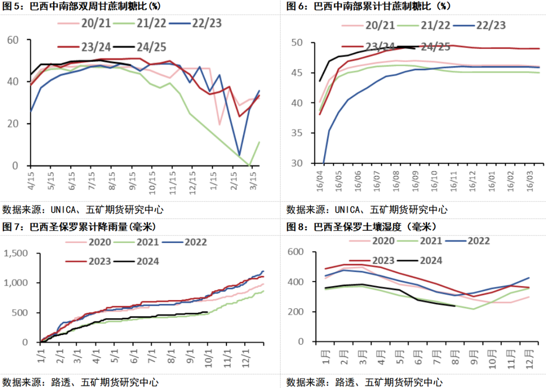巴西中南部地区降雨时间分布并不均匀,每年10月至次年4月是巴西的雨季,而每年5月至9月是巴西的旱季,因此近期巴西几乎无降雨也属于正常现象。但截至目前巴西累计降雨量是近五年以来第二低水平,仅高于2021年,并且土壤湿度和2021年水平接近,处于历史低位。总体而言目前巴西干旱的天气对本榨季甘蔗产量影响并不明显,而对于下榨季甘蔗产量影响还是存在较大不确定性,需要看10月份雨季到来后的气象情况再作判断。