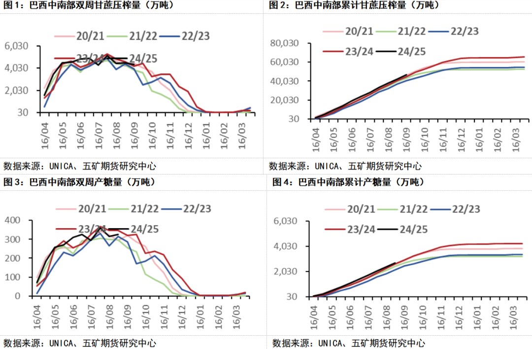 9月下旬以来原糖价格大幅上涨,因巴西中南部地区天气干旱和火灾频发。截至9月30日ICE原糖3月合约收盘价报22.53美分/磅,较之前一月上涨3.09美分/磅,或15.9%。但从目前生产数据来看,巴西中南部甘蔗及食糖产量维持同比增长,干旱和火灾对本榨季产量的影响并没有明显的体现。据UNICA最新数据显示,2024/25榨季截至9月上半月,2024/25榨季截至9月上半月,巴西中南部地区累计入榨量为46626.2万吨,较去年同期的44854.8万吨增加1771.4万吨,同比增幅达3.95%;累计制糖比为48.96%,较去年同期的49.37%减少0.41%;累计产糖量为3032.7万吨,较去年同期的2927.6万吨增加105.1万吨,同比增幅达3.59%。从最新的双周产量来看变化亦不大,9月上半月巴西中南部地区甘蔗入榨量为4293.3万吨,较去年同期的4190.3万吨增加103万吨,同比增幅2.46%;制糖比为47.86%,较去年同期的51.04%减少3.18%;产糖量为312.4万吨,较去年同期的312.6万吨减少0.2万吨,同比降幅达0.08%。但值得关注的是,当前的甘蔗制糖比例低于榨季初期预期,截至9月上半月累计甘蔗制糖比只有48.96%,不仅低于去年同期的49.37%,也远低于榨季初期预期的51.5%。按照6.5亿吨甘蔗压榨量计算,巴西中南部地区的食糖产量将相较于榨季初期预期减少超过200万吨。
