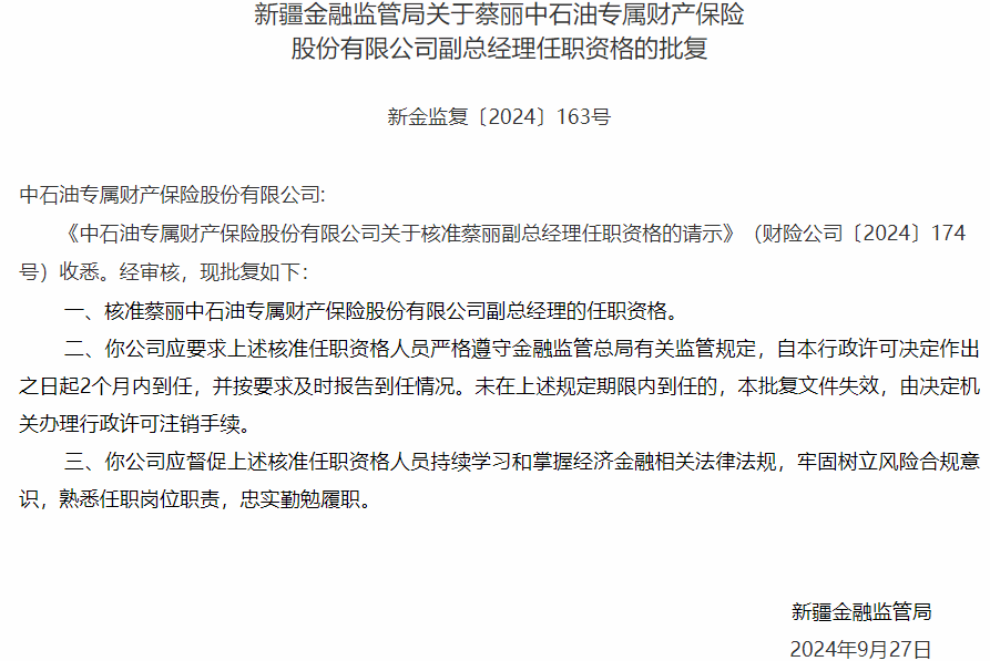 日前,金融监管总局新疆监管局发布批复信息显示,核准蔡丽中石油专属财产保险股份有限公司副总经理的任职资格。