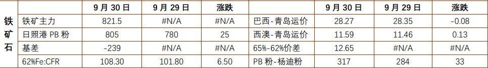 国企假期国内铁矿石期货休市,海外铁矿上涨 4.6%。9 月 30 日-10 月 6 日 Mysteel 澳洲巴西铁矿发运总量 2402.6 万吨,环比减少 356.3 万吨。澳洲发运量 1765.6 万吨,环比减少 147.5 万吨,其中澳洲发往中国的量 1433.3 万吨,环比减少 157.6 万吨。