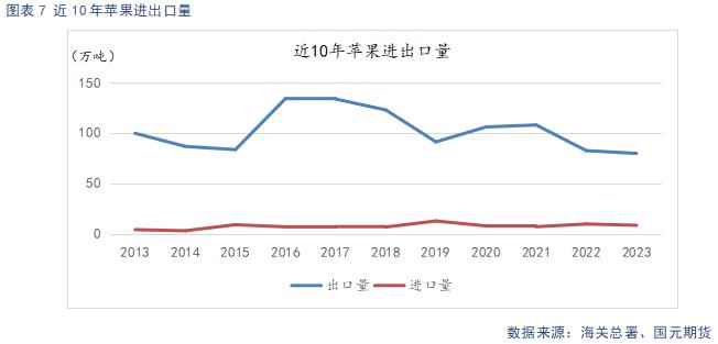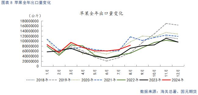 据海关总署数据显示,2024年8月,出口量为8.3万吨,环比增长26.3%,同比增长31%。二三季度处于季节出口淡季,但今年果价下跌幅度较大,适合出口的货源价格优势明显,同比出现较大增幅,今年出口整体表现良好。不过鲜苹果以内需为主,在内需低迷的背景下,出口对价格有一定支撑,却难以扭转供强需弱的整体格局。