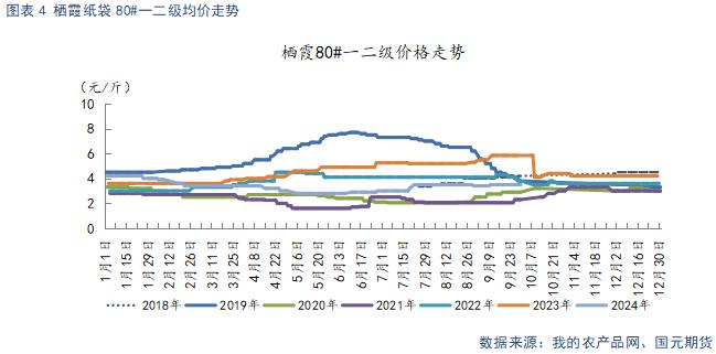 国庆期间,新季晚熟陆续上市,目前多数新果仍在等待上色,整体上市量不大。节前因担忧上色问题,市场对开秤价的预期虽低于去年,但要高于之前的预估,盘面在节前出现较大反弹。不过由于上个果季销售困难,存储货源普遍出现亏损,加上今年产量、质量均较去年有所提升,最终回归基本面,反弹空间有限,新季行情依然偏弱看待。因此开秤前期,贸易商采购偏谨慎,果农被动入库压力较大,压价急售情绪升温,待后续新果上量后,价格有进一步下调空间。主力2501合约逢高沽空,建议区间6400-6800元/吨。