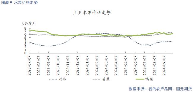 截止10月4日,西瓜均价3.8元/公斤,较上周环比上涨0.07元/公斤。鸭梨均价6.29元/公斤,较上周环比上涨0.2元/公斤。夏季水果市场供应量减少,处于逐步退市的阶段,价格持续走高,而秋季水果还未大量上市,价格相对偏强。时令水果在中秋前后对苹果消费替代作用减弱。