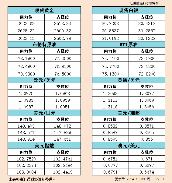汇通财经APP讯——10月9日欧市黄金、白银、原油、美元指数、欧元、英镑、日元、瑞郎、澳元支撑阻力位一览。