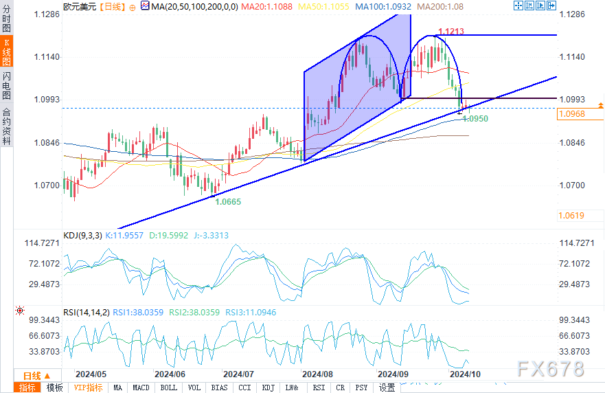 8月和9月两个月,欧元/美元升至1.09阻力位上方,并两次测试1.12这个重要阻力位,此前美元失去了利率支持,对快速大幅降息的押注击败了传统的避险资金流入美元。疲软的欧元(波兰经济)部分抵消了美元的疲软。在10月初美国数据强劲后,美元重拾升势,欧元兑美元跌破1.1002的颈线。这个形态的目标在1.08附近。