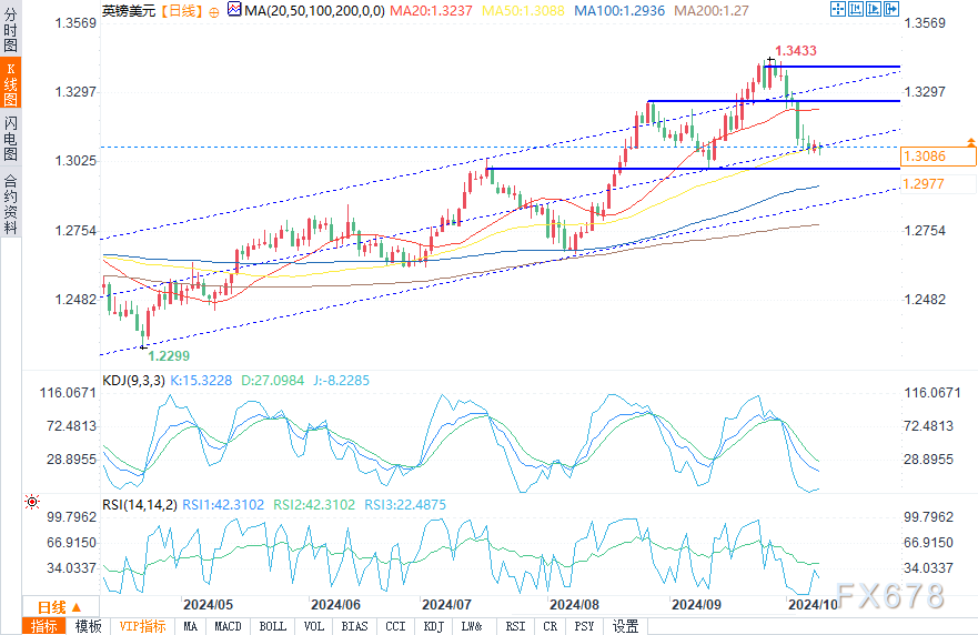 英镑/美元跌至55日简单移动平均线(SMA)1.3066的支撑位,目前仍守在55日均线上方。如果英镑/美元继续下跌,下一个目标将是9月低点1.3002。1.30这一支撑位是中期趋势的关键,跌破该支撑位可能导致200日移动均线1.2784重新出现。