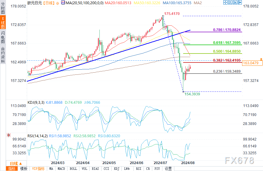 欧元/日元继续在162.89-164.24阻力位下方交易。如果它被上破,中期看涨反转将形成。
