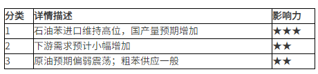 10月份纯苯-苯乙烯及下游产业链或继续承压下挫运行。一方面,宏观改善预期有限,国际原油市场仍面临走弱风险,对国内化工品市场产生压力;另一方面,四季度部分终端领域需求逐渐转入淡季,但上游端产品供应相对稳定,尤其纯苯市场,国产及进口预期同步增加,基本面压力较为突出。因此,在宏观及产业链基本面预期均难乐观下,市场或仍延续震荡回落概率较大。