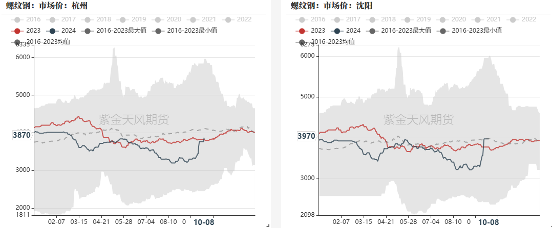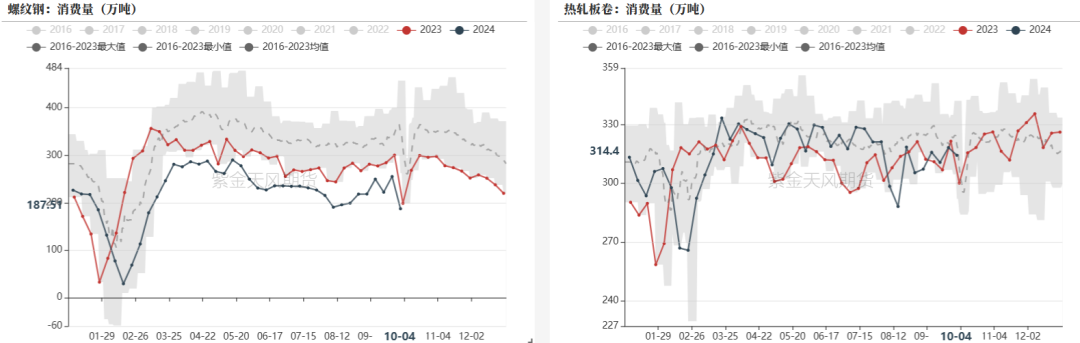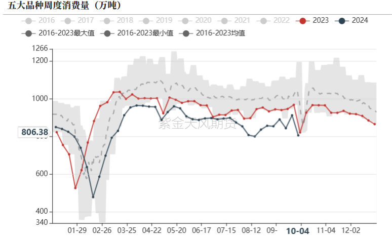 需求方面,本周五大品种消费总量达806.38万吨,环比下降106.99万吨,降幅11.7%,相比于去年同期下降1.9%。