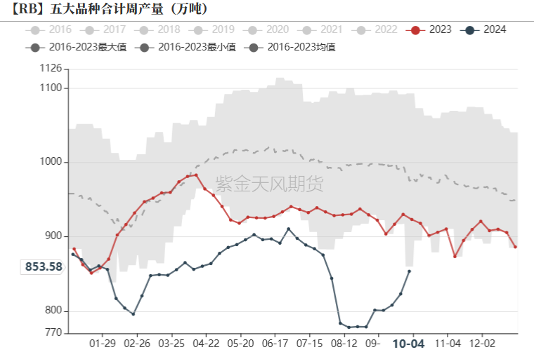 本周,五大品种合计产量为853.58万吨,环比上周上升30.53万吨(增幅3.7%),去年同期产量为923.41万吨,同比下降7.6%。