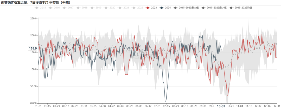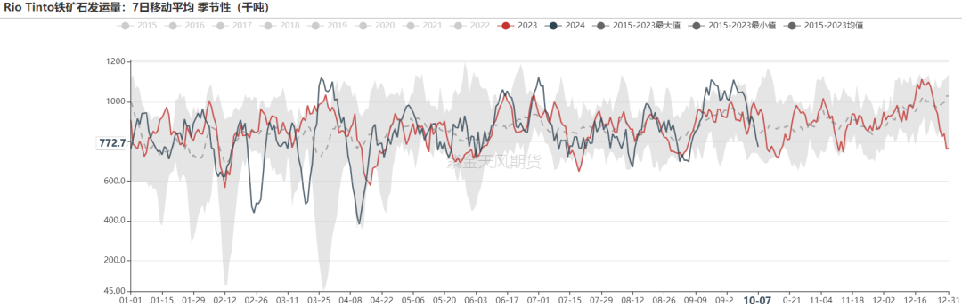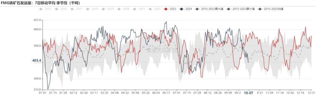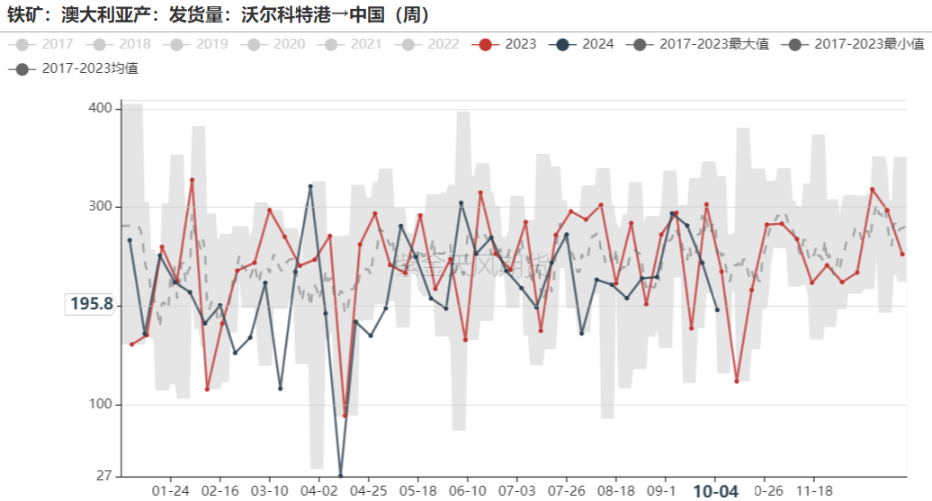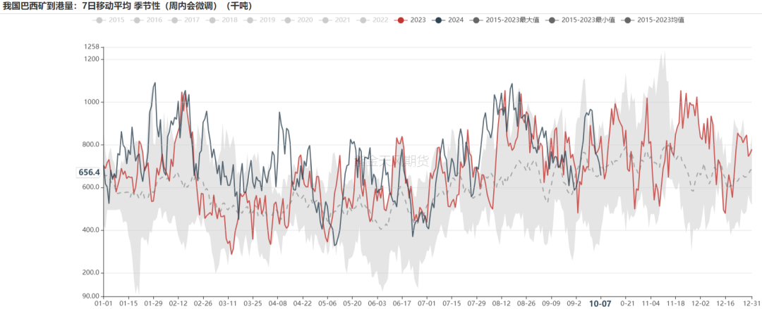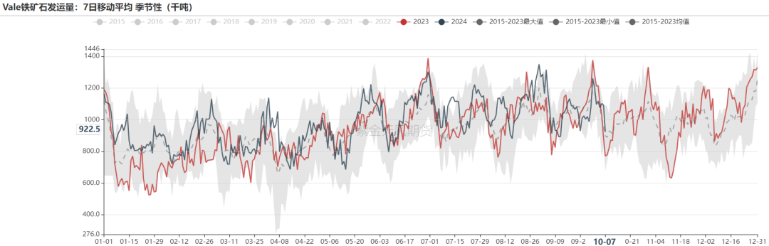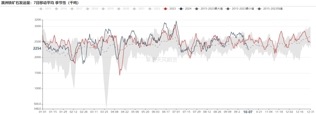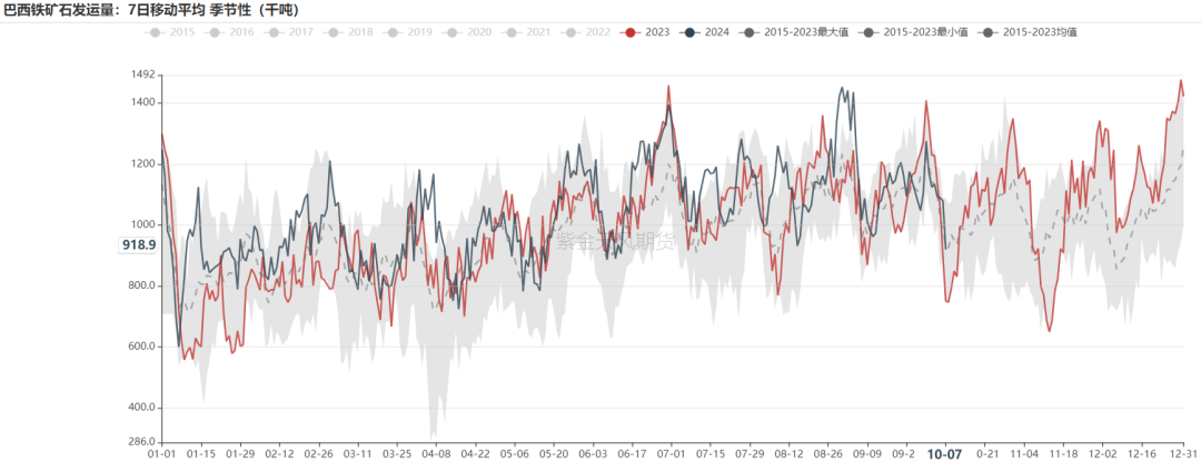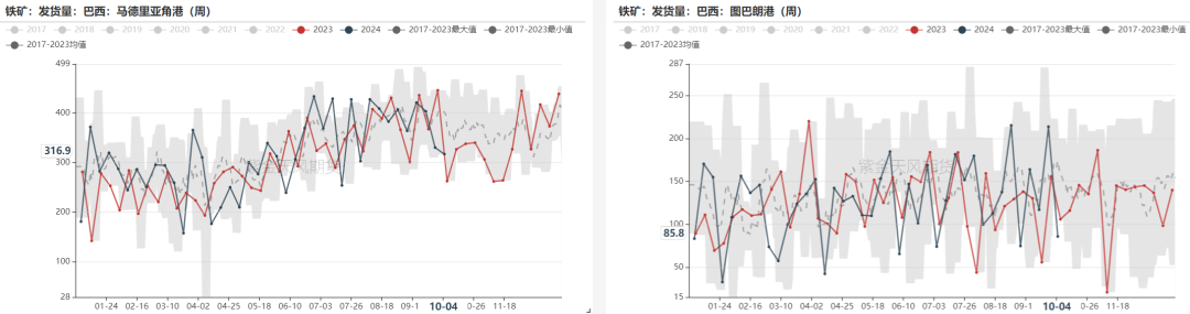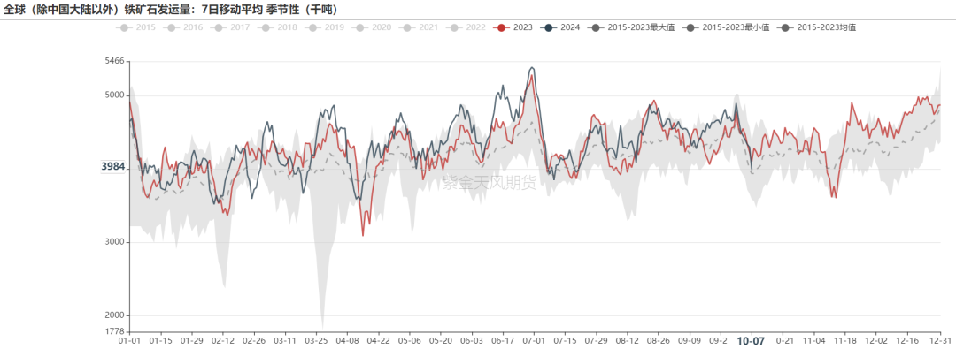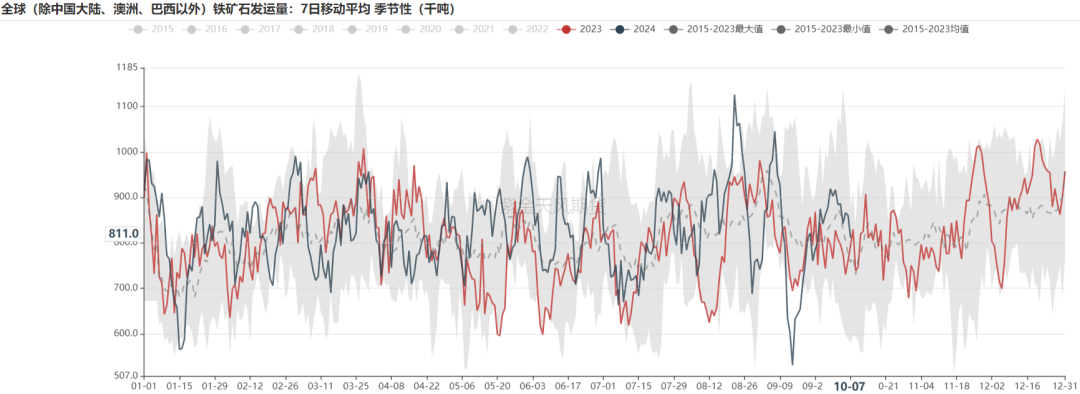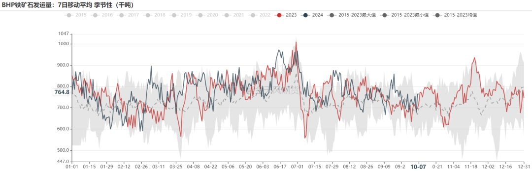 路透口径:2024年10月7日,路透全球铁矿7日移动平均发货量3984千吨,周环比减18.6%,同比减2.9%。澳洲7日移动平均发货量2254千吨,周环比减17.1%,同比减11.9%;巴西7日移动平均发货量919千吨,周环比减28%,同比增23%。