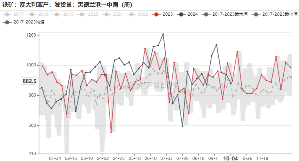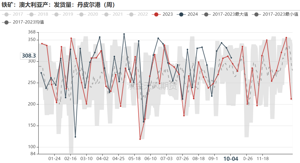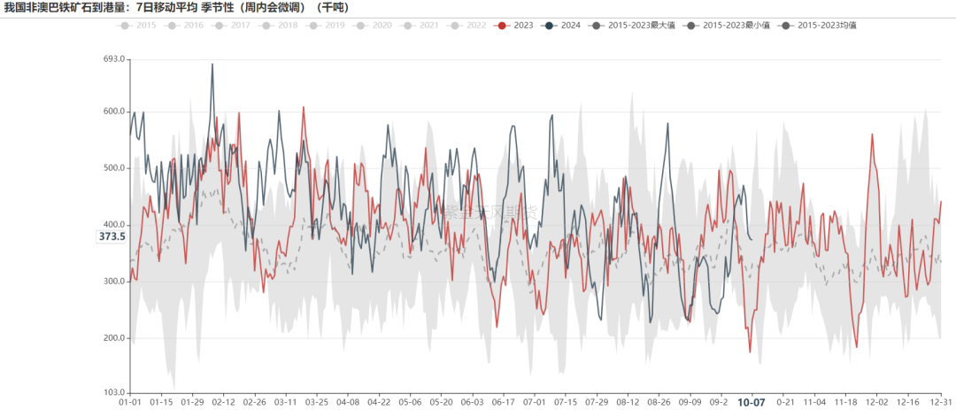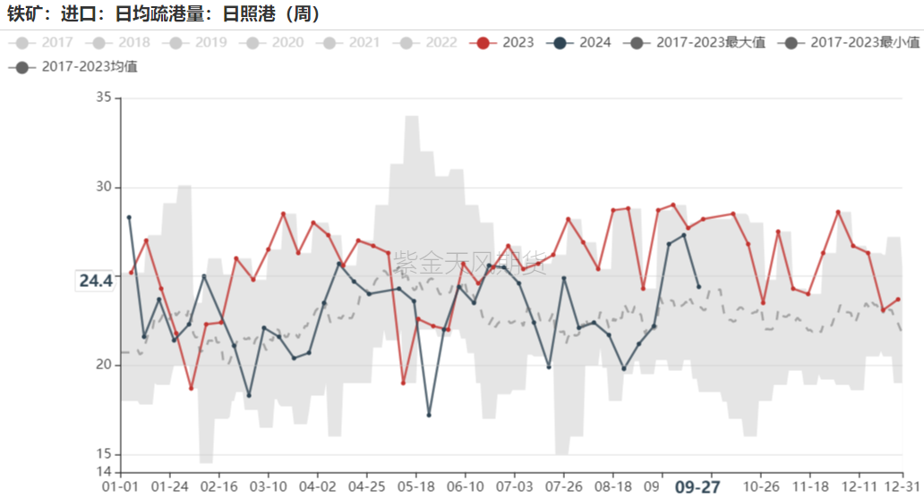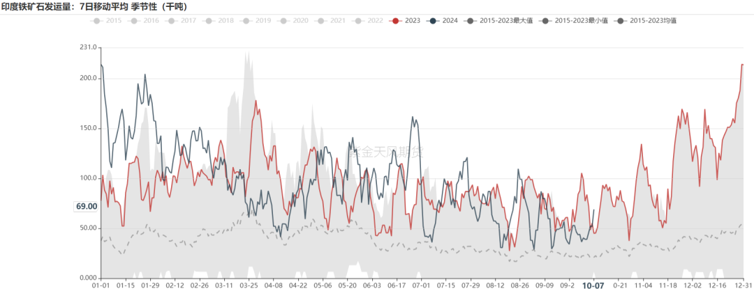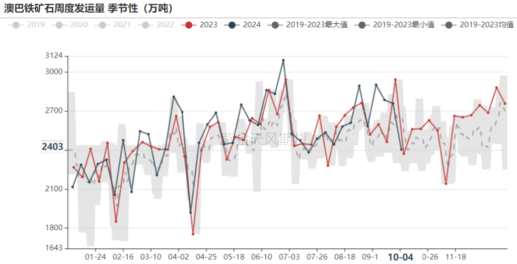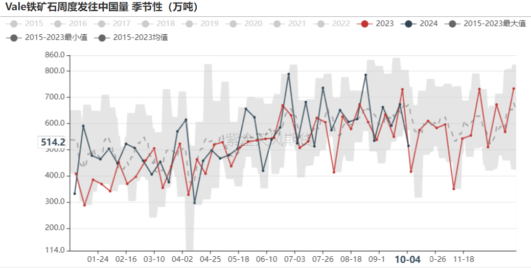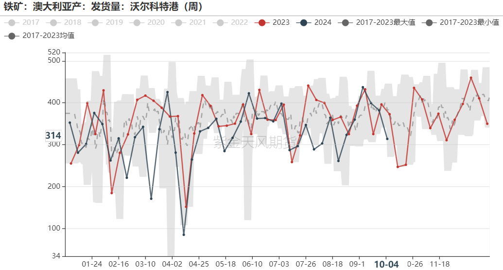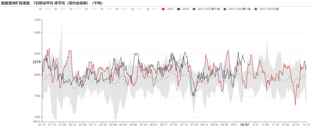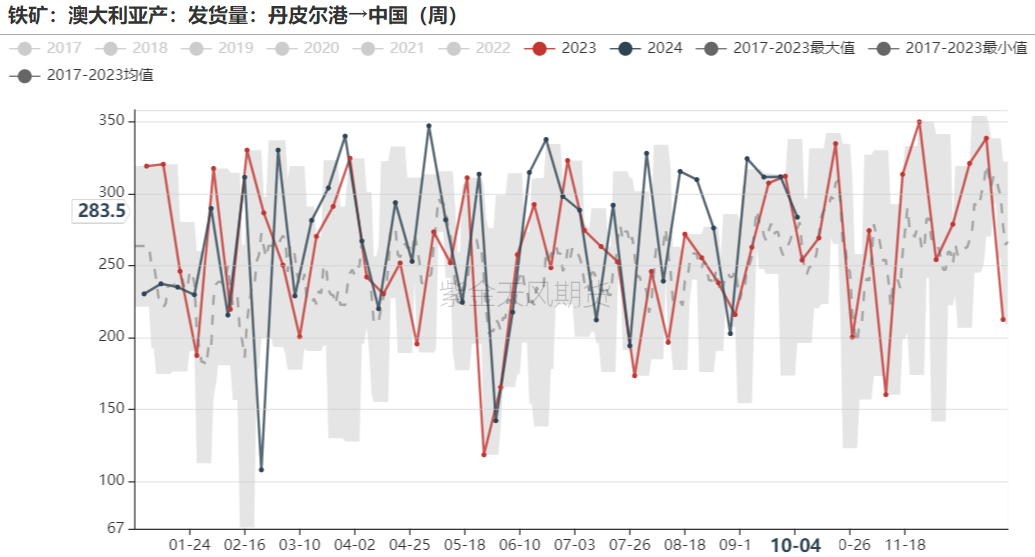 路透口径:2024年10月7日,路透全球铁矿7日移动平均发货量3984千吨,周环比减18.6%,同比减2.9%。澳洲7日移动平均发货量2254千吨,周环比减17.1%,同比减11.9%;巴西7日移动平均发货量919千吨,周环比减28%,同比增23%。