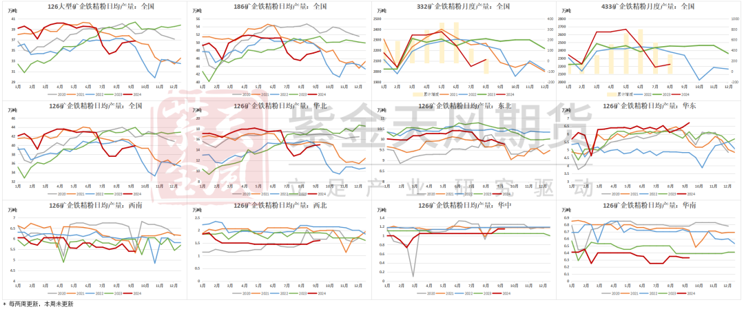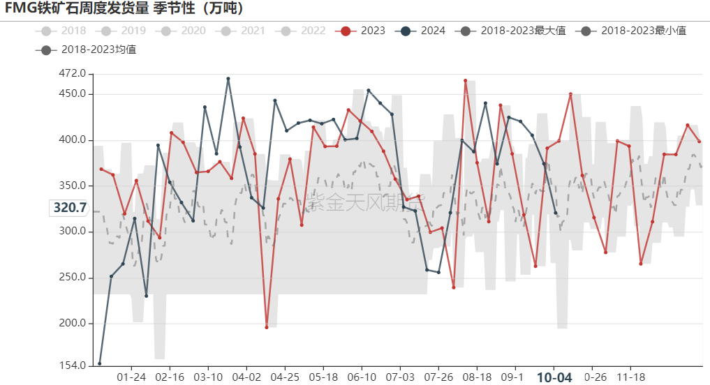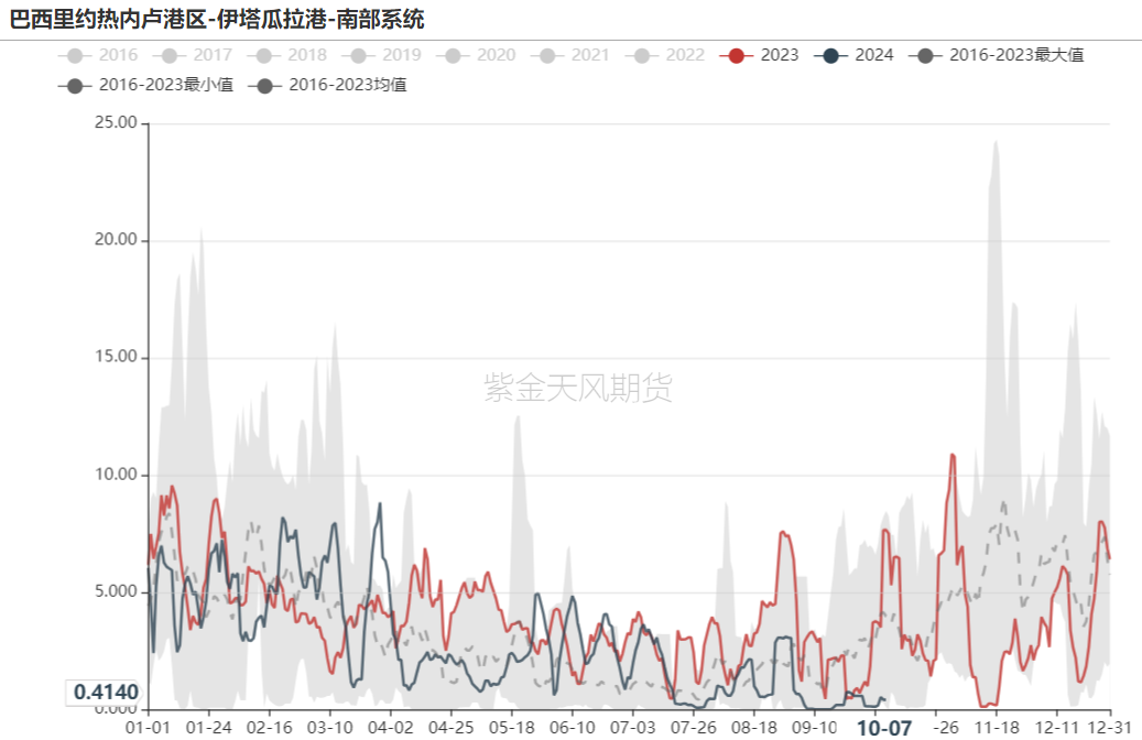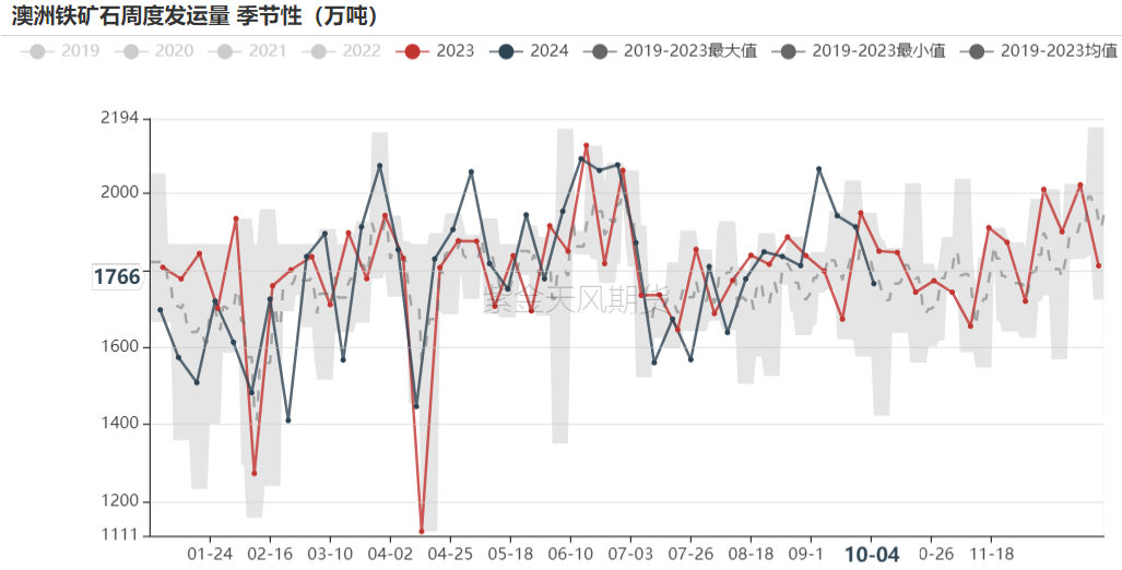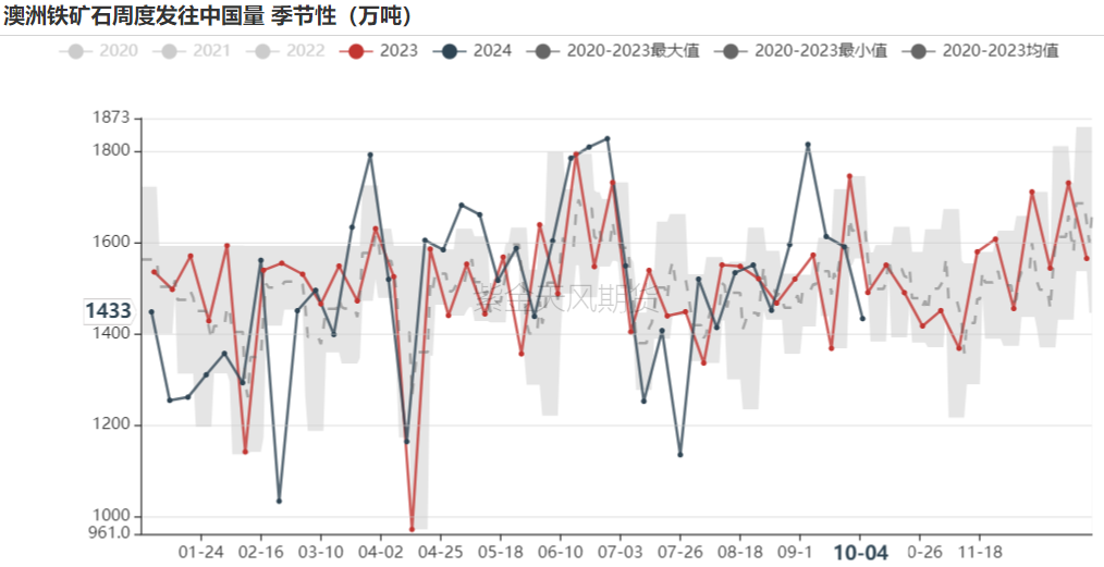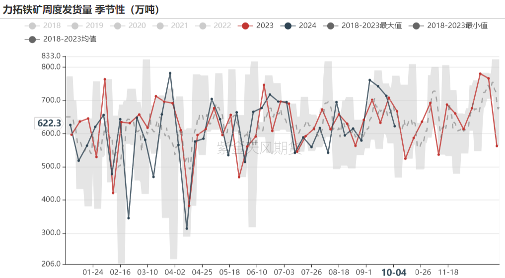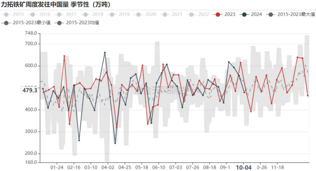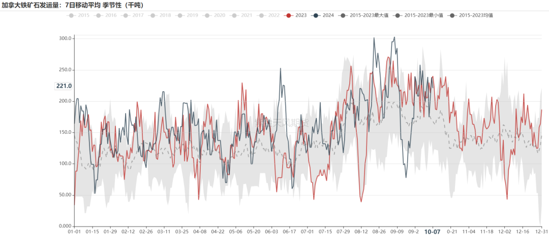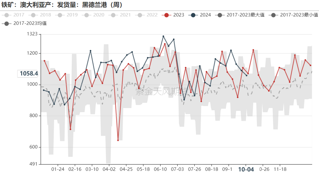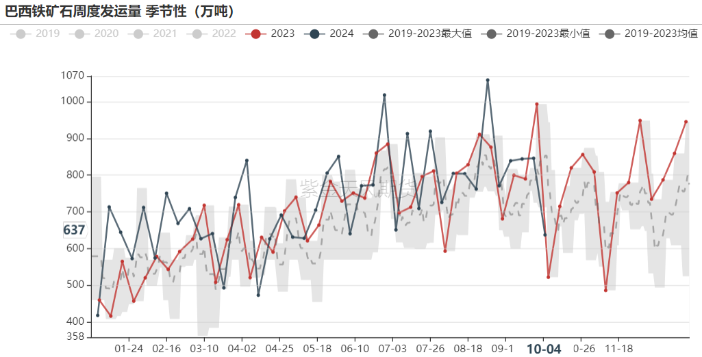 路透口径:2024年10月7日,路透全球铁矿7日移动平均发货量3984千吨,周环比减18.6%,同比减2.9%。澳洲7日移动平均发货量2254千吨,周环比减17.1%,同比减11.9%;巴西7日移动平均发货量919千吨,周环比减28%,同比增23%。