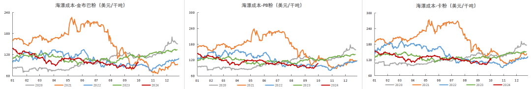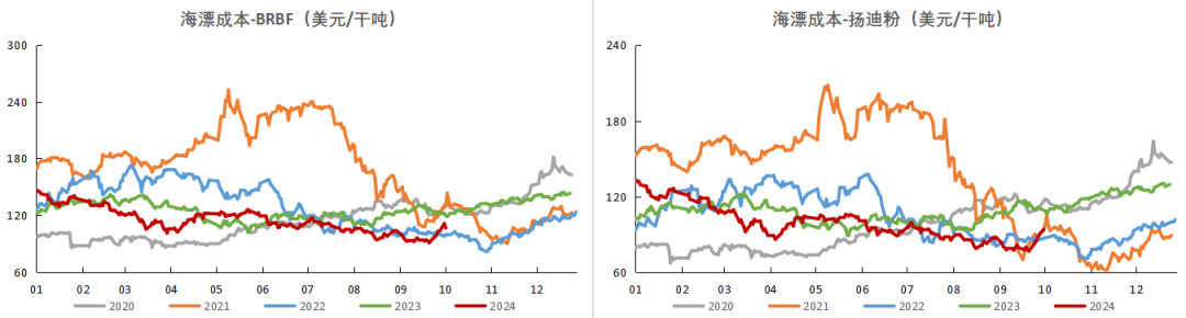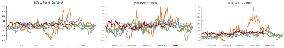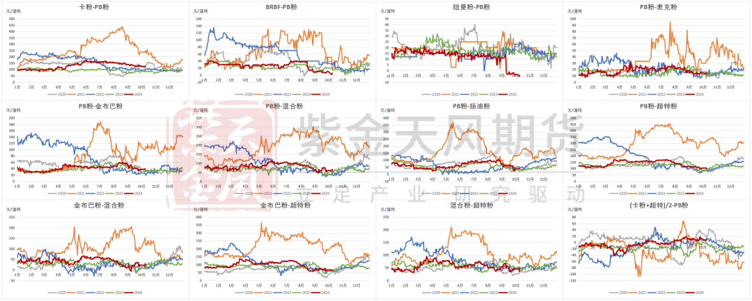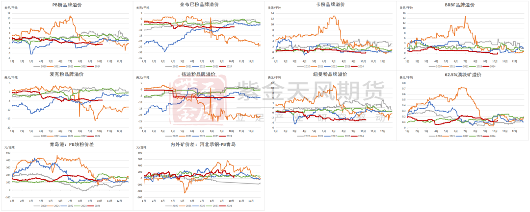 品种间差异 混合粉价格走弱明显;部分主流品种溢价下行,块粉价差暂稳,内外矿价差走扩。