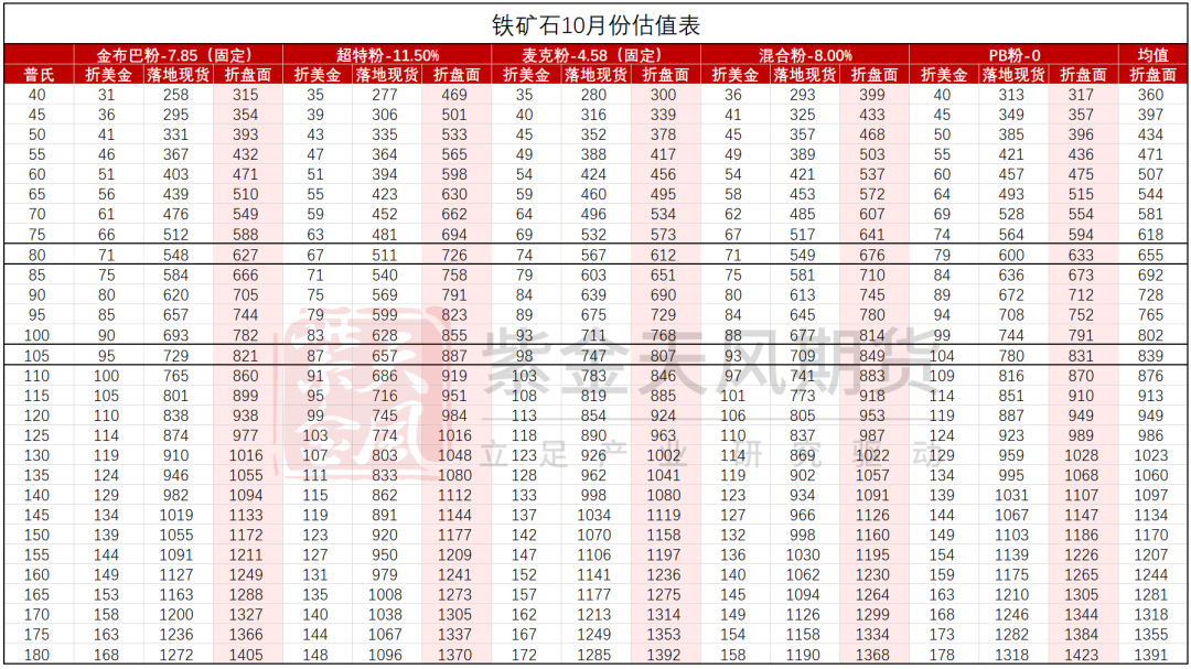 折扣&汇率 10月普氏62指数均值为108,对应盘面估值约为830。