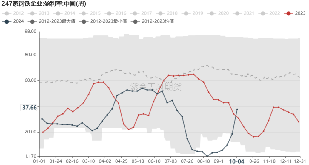 钢厂:钢厂盈利率大幅上行至37.66%;铁水228.02万吨,环比+3.16万吨