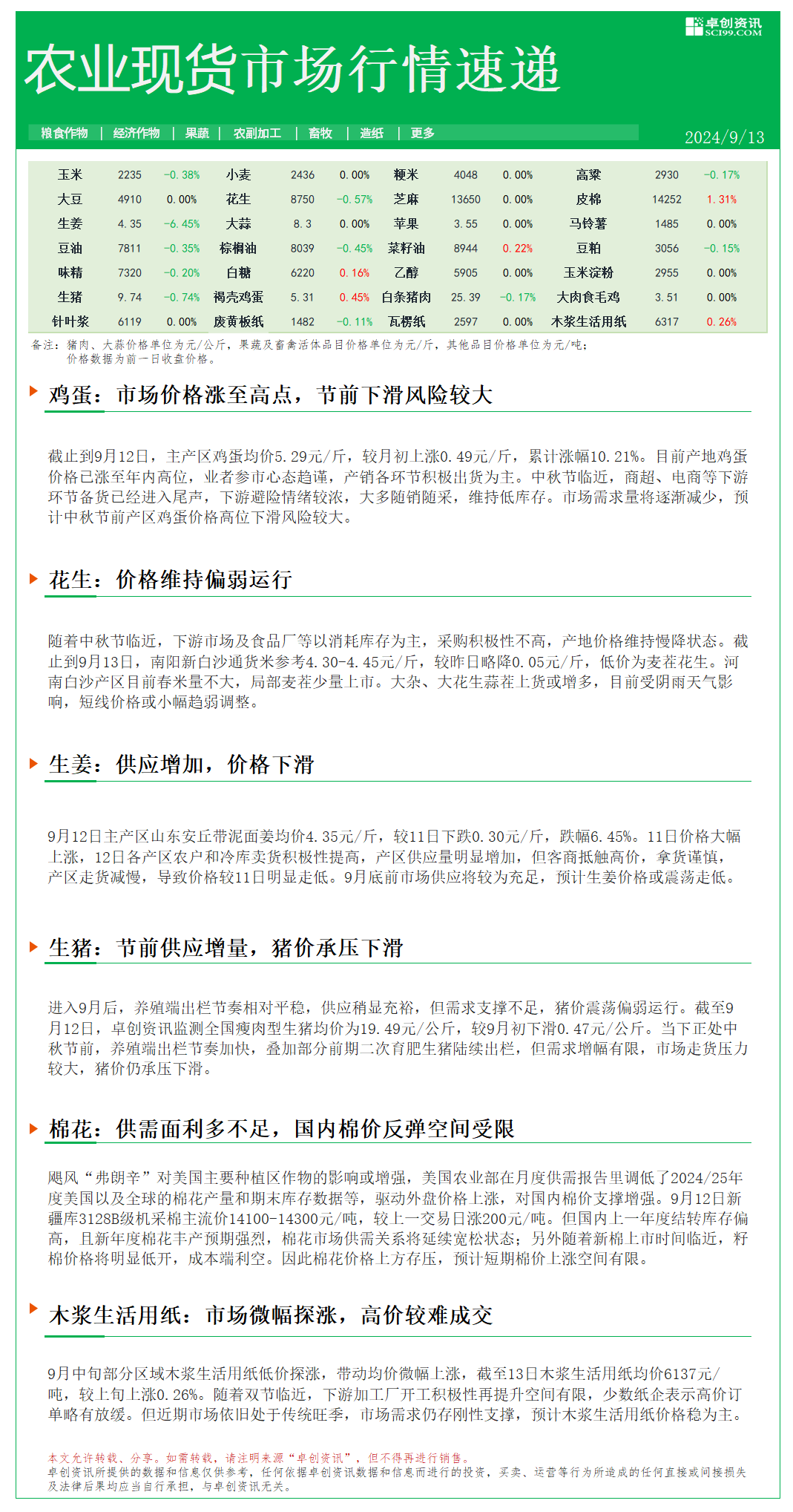 截至9月12日,卓创资讯监测数据显示,农业行业28个重点现货品种价格中,有5个上涨,11个下跌,12个稳定。其中,皮棉价格涨幅最大,涨幅1.31%;生姜价格跌幅最大,跌幅6.45%。