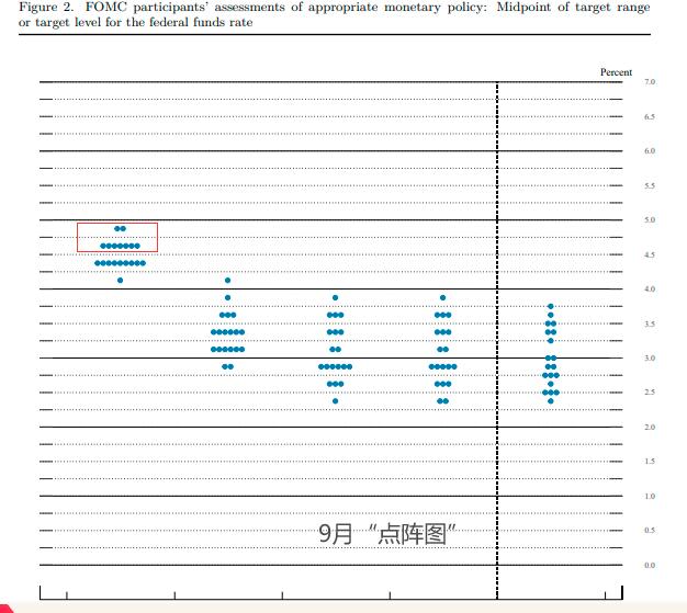 9月决议发布的最新利率点阵图显示,有多达七位官员预计年底联邦基金利率目标区间将落在4.5%-4.75%,这表明他们预计美联储只会在今年最后两次会议中的一次会议上降息25个基点。点阵图上更是有“两个点”(两位决策者)认为,美联储今年下半年的政策利率将不会再发生任何变化。