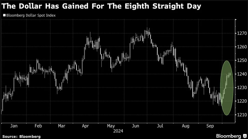 行情数据显示,ICE美元指数在本周三进一步触及了八周来的最高位。彭博美元综合指数更是已连续八个交易日上涨——这是自2022年4月以来最长的连续上涨势头。