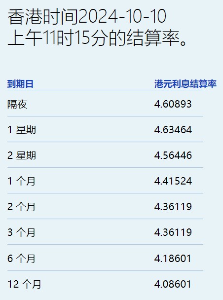 10月10日,港元拆息几乎全线上升,但一个月期下跌。隔夜息回升19基点至4.60893%,而与楼按相关的一个月拆息则连跌两天,报4.41524%,为10月2日后最低。反映银行资金成本的三个月拆息结束两连跌,微升至4.36119%。长息方面,六个月及一年期分别升至4.18601%和4.08601%。