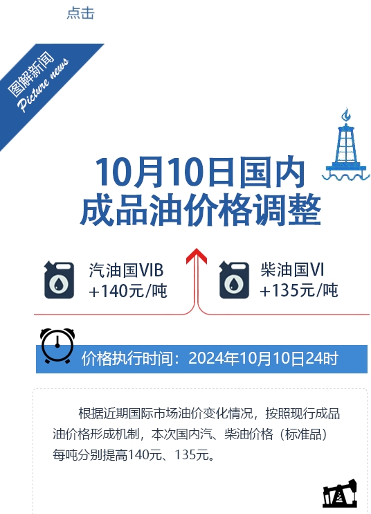 国家发展改革委发布通知,从10月10日24时起,国内汽、柴油每吨分别上调140元和135元。用92号汽油加满50升的油箱将多花5.5元。