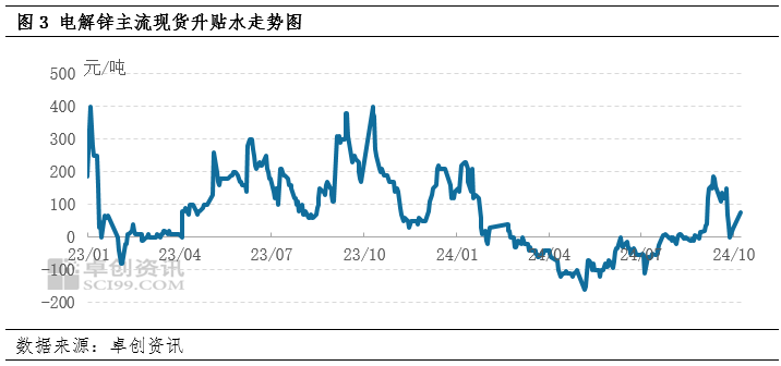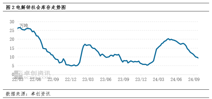 9月行情上移,主要有两方面原因:其一,市场宏观情绪回温。9月美联储降息落地,下调50个基点;9月国内释放将出台货币政策调整的一揽子措施,其中包括降低存款准备金率0.5个百分点、7天期逆回购操作利率下调0.2个百分点、降低存量房贷利率、创设结构性货币政策工具支持资本市场等。其二,市场弱供应与需求边际好转。根据卓创资讯调研,国内锌精矿供应紧张情况延续,加工费低位运行,冶炼厂利润亏损,联合减产逐步落地,锌产出水平偏低,导致弱供应情况出现。而9月需求边际好转,结束了夏季的高温和梅雨,下游和终端项目开工表现好转,带动需求回温。因此,锌锭社会库存不断下滑。根据卓创资讯监测,截至9月最后一周,锌锭样本社会库存总量为8.51万吨,相比8月最后一周的11.71万吨,下滑了3.2万吨,幅度达到27.33%。