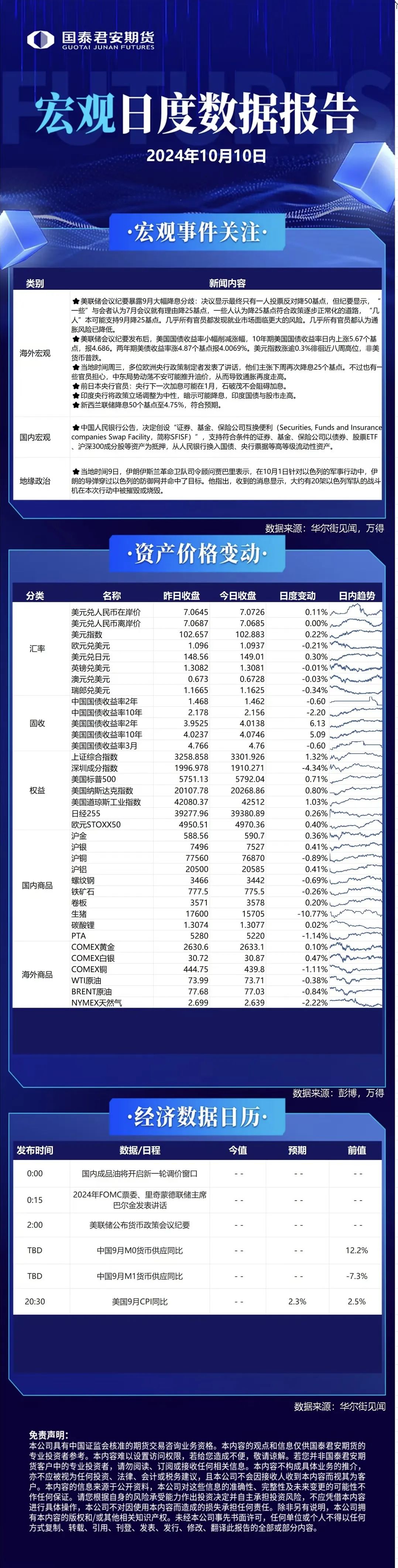 今日重点关注:集运指数(欧线)、合成橡胶。美国9月CPI超预期,美联储降息节奏是否变化值得关注