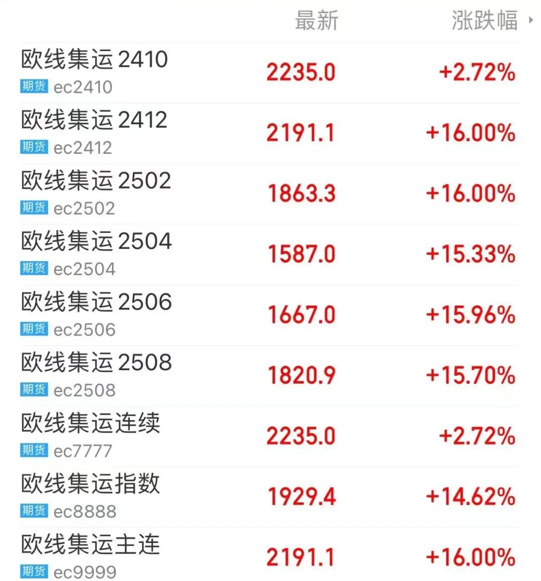 10月以来,集运指数(欧线)期货盘面波动较大。在长假后首个交易日大跌后,本周四市场情绪突然反转,3个合约涨停,3个合约接近涨停。