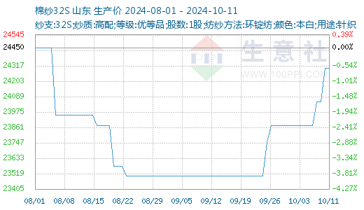 据生意社商品行情分析系统显示:节后归来,在宏观政策利好影响下,纯棉纱市场价格重心继续上移,但整体购销淡稳。截至2024年10月11国内山东地区21S纯棉纱市场参考价格在23000元/吨左右,较节前上涨1.77%;32S纯棉纱市场参考价格在24300元/吨,较节前上涨1.78%。