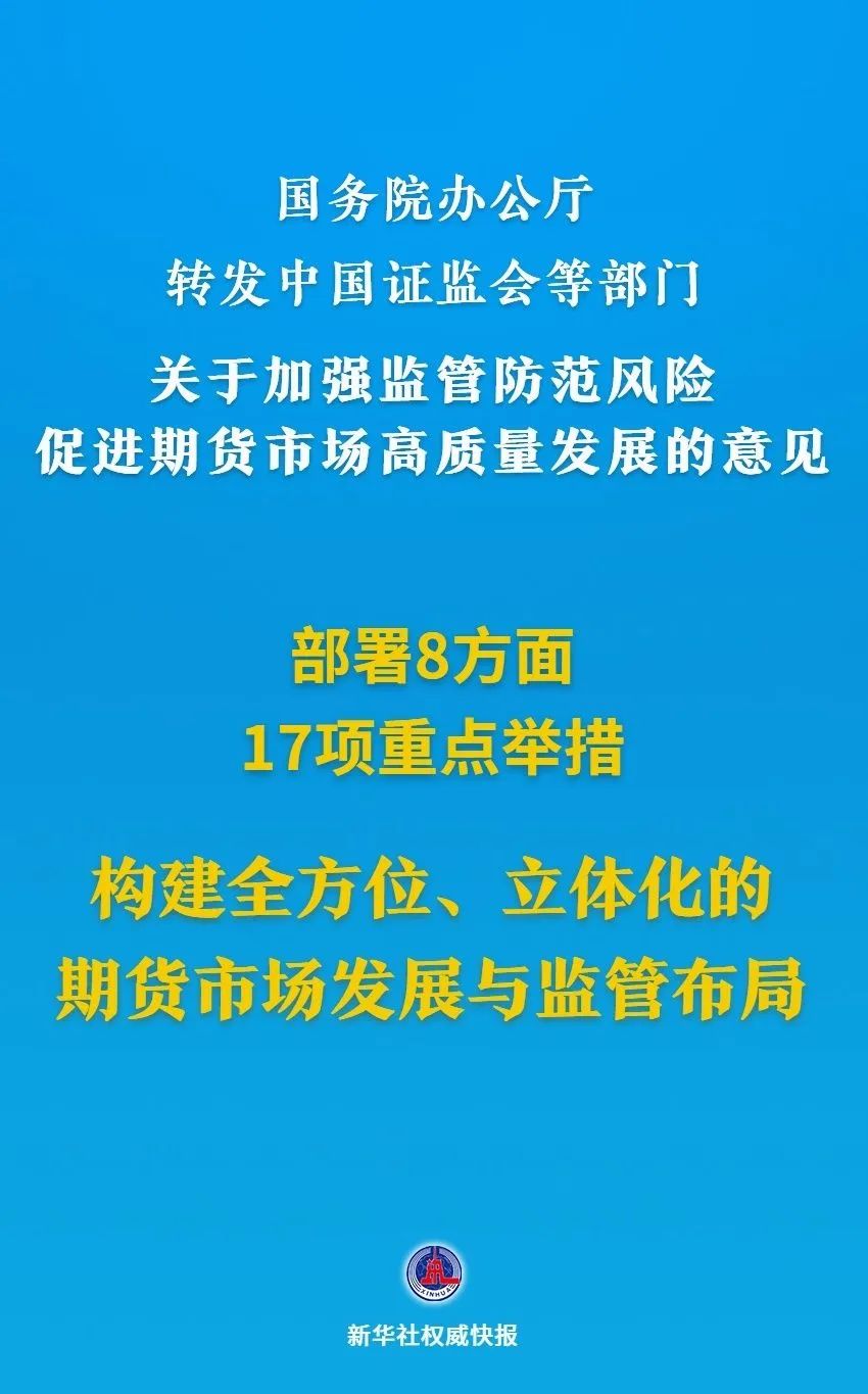 日前,国务院办公厅转发中国证监会等部门《关于加强监管防范风险促进期货市场高质量发展的意见》。