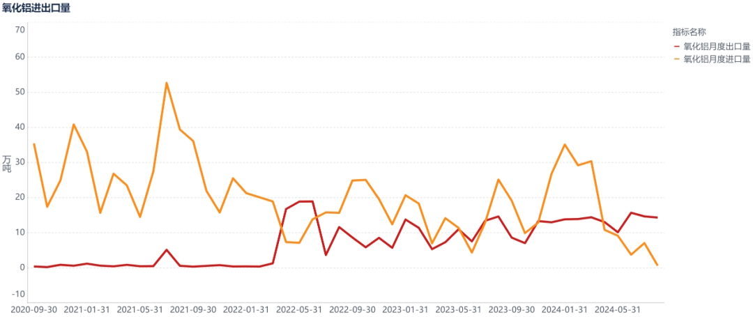 进出口方面,8月我国出口氧化铝14.33万吨,进口0.63万吨,净出口13.7万吨。