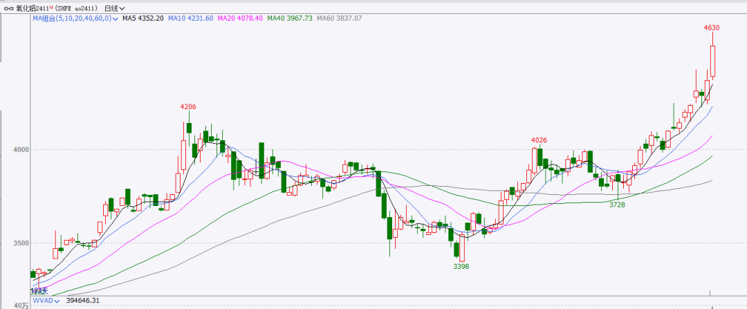 10月11日氧化铝主力2411合约再度大幅上涨,刷新上市以来新高,截止收盘报4553,涨幅4.64%。