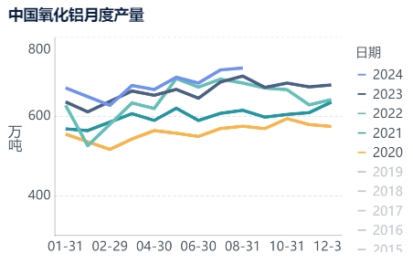 (1)供应端。8月我国铝土矿产量为508.87万吨,环比+0.58%,同比-9.86%,北方铝土矿尚未听闻大规模复产消息。进口方面,8月我国进口铝土矿1554.60万吨,环比+3.64%,同比+34.23%。
