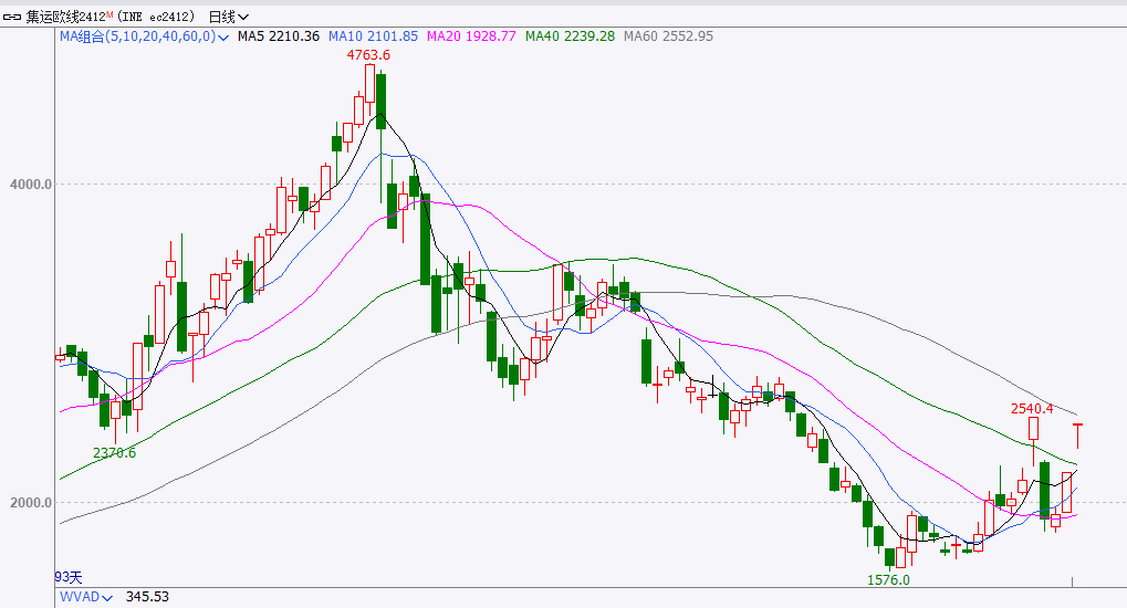 部分航司释放挺价意向,叠加地缘风险情绪带来利多扰动,今日集运市场多头情绪依然火热,多合约盘中涨停,主力EC2412合约收于2494.3点,涨幅达19%。