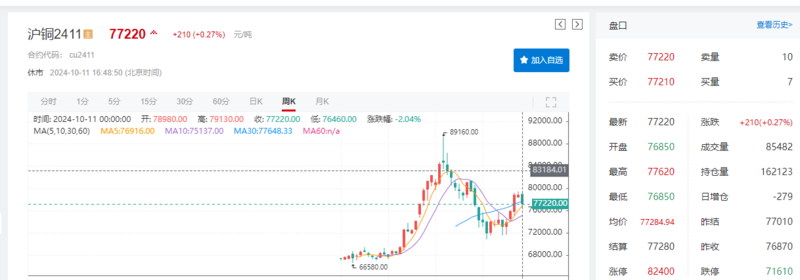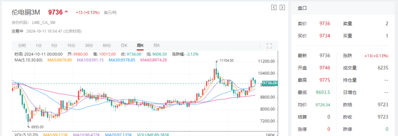 SMM10月11日讯:国庆节期间,美国公布的9月非农数据超预期,市场对美联储11月降息50个基点的预期减弱,美元出现反弹,使得铜等基本金属承压。而国庆节前政策大礼包密集发放带来的市场乐观情绪有所减弱以及国内铜库存的累库均压制了铜价的市场表现,使得铜价本周跌多涨少。进入周尾,随着美国9月CPI反弹以及美国最新一周初请失业金人数大增,市场对于美联储11月降息25个基点的预期仍然较强,美元走软,以及市场预期国内后续出台更多利好政策,铜价出现反弹。截至10月11日16:54分,伦铜涨0.13%,报9736美元/吨,伦铜本周跌幅暂时为1.95%;沪铜涨0.27%,报77220元/吨,本周的跌幅为2.02%。